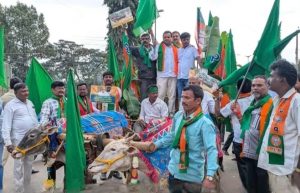 ಇದಕ್ಕೂ ಮುನ್ನ, ಬಿಜೆಪಿ ಸೇವಾ ಸೌಧ ಕಚೇರಿಯಿಂದ ತಾಲ್ಲೂಕು ಕಚೇರಿಯವರೆಗೆ ಎತ್ತಿನ ಬಂಡಿಯಲ್ಲಿ ಆಗಮಿಸಿದ ಬಿಜೆಪಿ ಮುಖಂಡರು ಮತ್ತು ಕಾರ್ಯಕರ್ತರು ರಾಜ್ಯ ಸರ್ಕಾರದ ವಿರುದ್ಧ ಘೋಷಣೆಗಳನ್ನು ಕೂಗಿ ಬೃಹತ್‌ ಪ್ರತಿಭಟನೆ ನಡೆಸಿದರು.