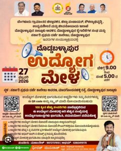 ಬೆಂಗಳೂರು ಗ್ರಾಮಾಂತರ ಜಿಲ್ಲಾಡಳಿತ, ಜಿಲ್ಲಾ ಪಂಚಾಯತ್, ಕೌಶಲ್ಯಾಭಿವೃದ್ಧಿ ಉದ್ಯಮಶೀಲತೆ ಮತ್ತು ಜೀವನೋಪಾಯ ಇಲಾಖೆ, ದೊಡ್ಡಬಳ್ಳಾಪುರ ತಾಲೂಕು ಆಡಳಿತ ಹಾಗೂ ದೊಡ್ಡಬಳ್ಳಾಪುರ ಕೈಗಾರಿಕೆಗಳ ಸಂಘ ಹಾಗೂ ಸರ್ಕಾರಿ ಪ್ರಥಮ ದರ್ಜೆ ಕಾಲೇಜಿ ದೊಡ್ಡಬಳ್ಳಾಪುರ ಇವರುಗಳ ಸಂಯುಕ್ತಾಶ್ರಯದಲ್ಲಿ ದೊಡ್ಡಬಳ್ಳಾಪುರ ಟೌನ್ ನ ಮಾದಗೊಂಡನಹಳ್ಳಿ ರಸ್ತೆಯಲ್ಲಿರುವ ಸರ್ಕಾರಿ ಪ್ರಥಮ ದರ್ಜೆ ಕಾಲೇಜಿನಲ್ಲಿ ಫೆಬ್ರವರಿ 27 ರಂದು ಉದ್ಯೋಗಮೇಳವನ್ನು ಆಯೋಜಿಸಲಾಗಿದೆ.